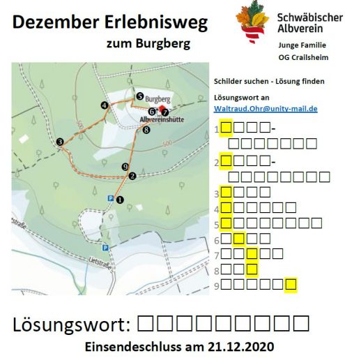 Liebe Wanderfreunde, da die geplante „Weihnacht im Winterwald“ leider nicht stattfinden kann haben Waltraud Ohr und Peter Seitz einen Erlebnisweg im Burgbergwald ausgeschildert.