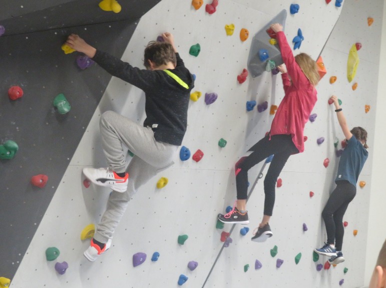 Je nach Griff-Farbe gibt es verschieden schwierige Parcours um von der einen zur anderen Seite der Halle zu kommen. Turnschuhe für die Halle bitte mitbringen.