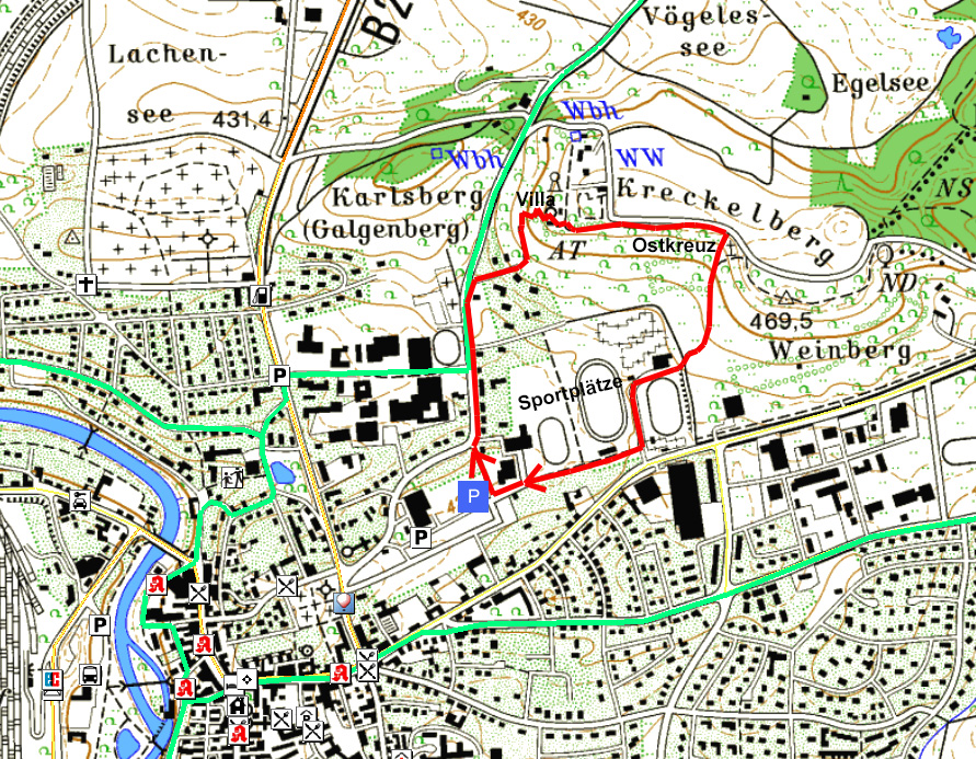 Wer trotzdem laufen möchte kann den unten abgebildeten Rundweg über die Beuerlbacher Straße, Villa, Ostkreuz und vorbei an den Sportplätzen zu machen.