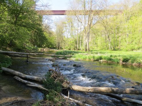 Unter einer stählernen Eisenbahnbrücke mit mächtigen Pfeilern hindurch begleitet uns die Bühler bis Rappolden, Weiter gehts nach Anhausen und in einem weiten Bogen auf der östlichen Bühlerseite zurück, vorbei an der obenliegenden Stöckenburg, zu unserem Ausgangspunkt.